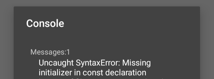 Following example shows first const variable is declared and then initialize. In output nothing will display but in console following error message displayed syntax error 'missing initializer in const declaration’.